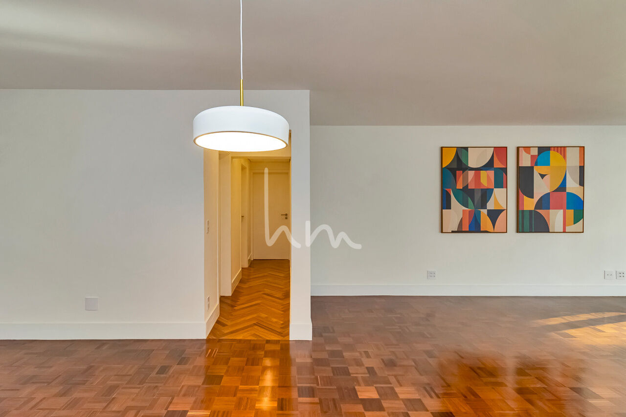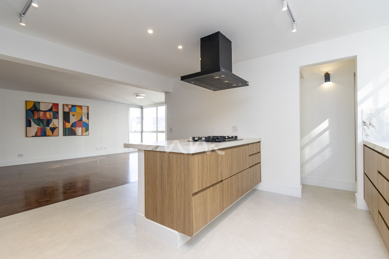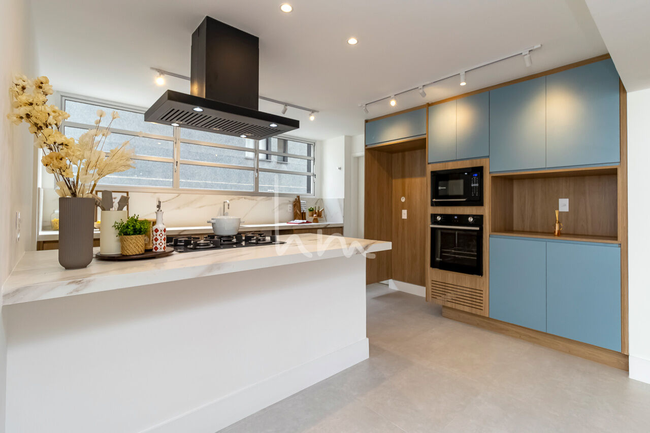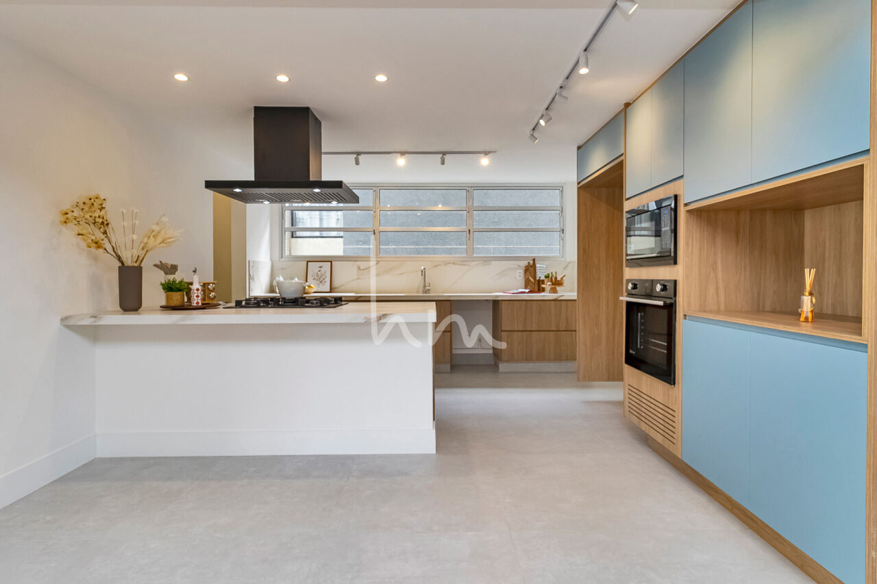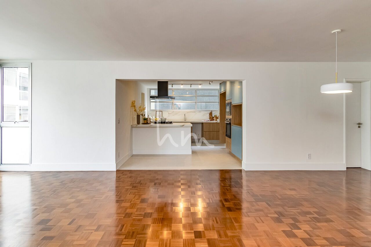 A planta quadrada desse apto facilitou a escolha de layout pela Arquiteta Cecília Hayashi (Ceci Yakabi Arquitetura e Reformas), que por acaso foi também a nossa parceira no outro apto que lá reformamos. Na área íntima conseguimos ter um banheiro para cada dormitório (duas suítes e um 3 dormitório com banheiro social). No espaço social temos uma ampla sala com janelão piso teto e vista para o belíssimo edifício Solar do Conde, um dos ícones da arquitetura modernista em Higienópolis. A sala tem um lindo piso em taco mini Parquet, original, que foi cuidadosamente restaurado. A cozinha se integra com a sala de maneira harmoniosa, criando um agradável espaço de convívio social. O Edifício Place L Etoile é um projeto de 1974 do Arquiteto João Kon, e está muito bem localizado na rua Pará, no trecho entre Bahia e Angélica, quase em frente à padaria Le Bleu.