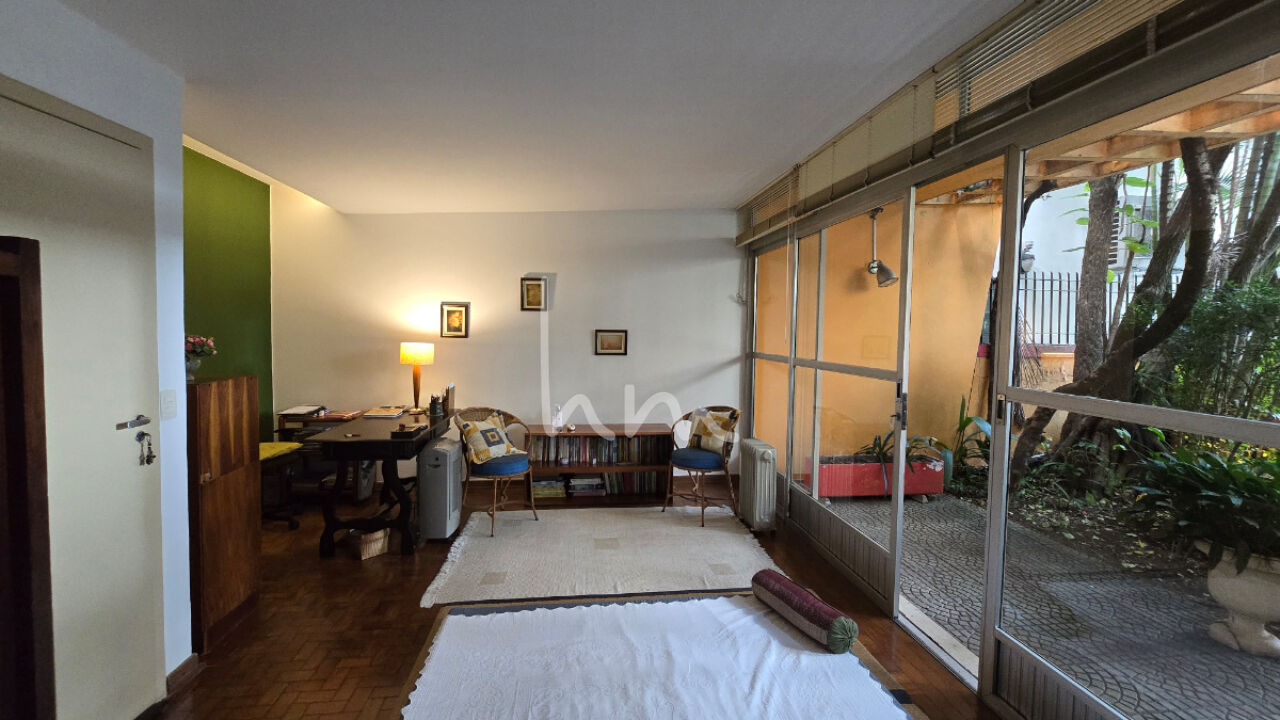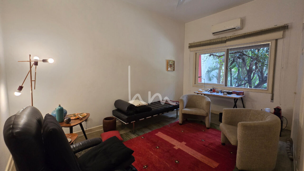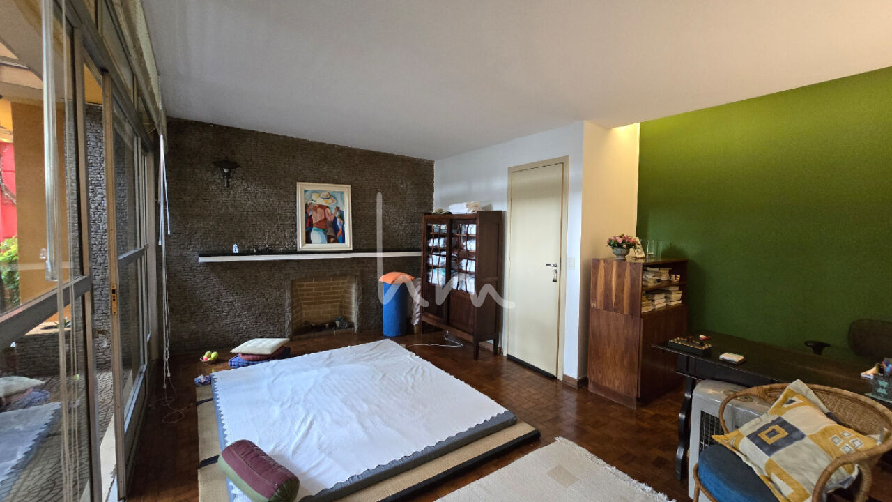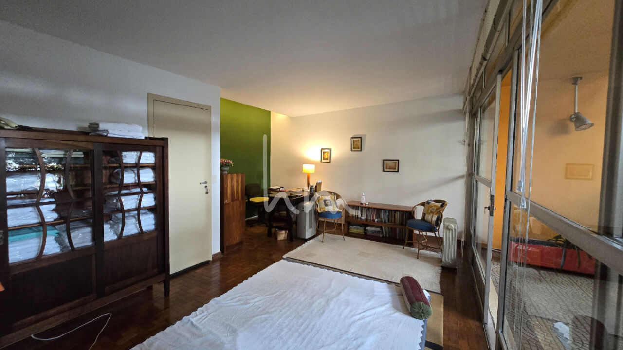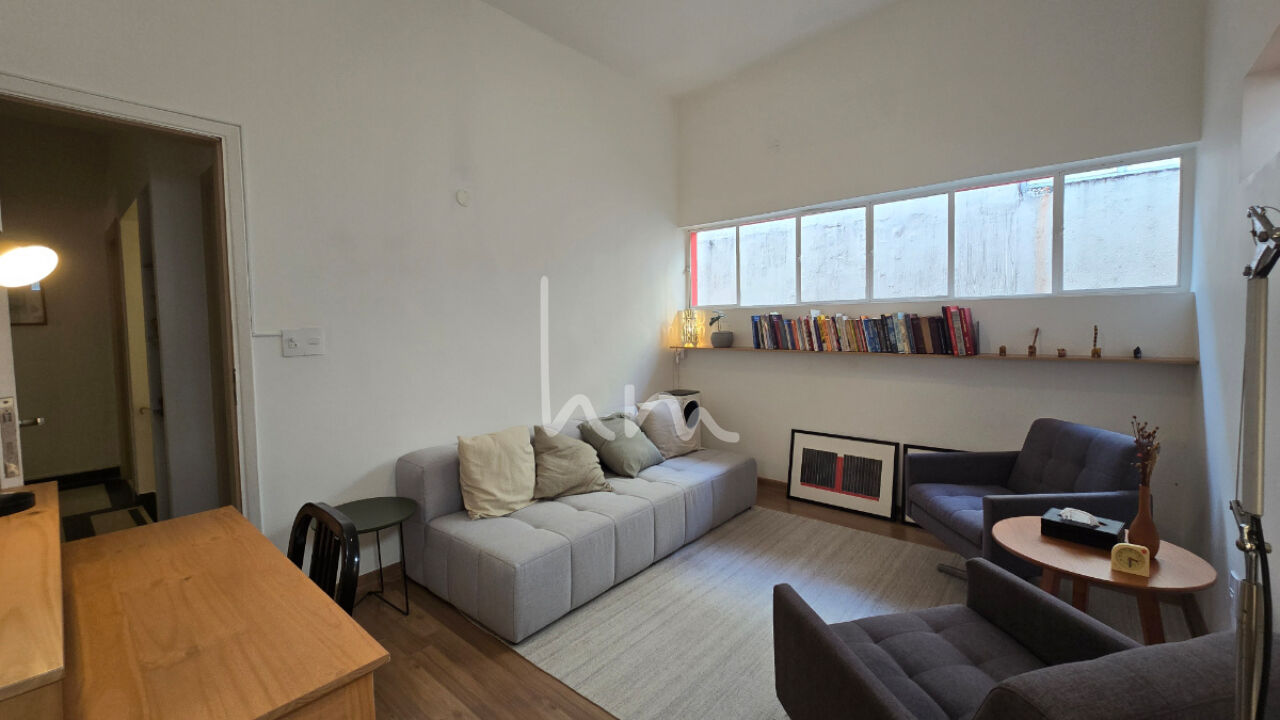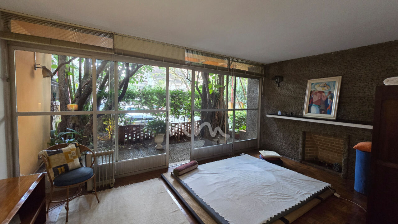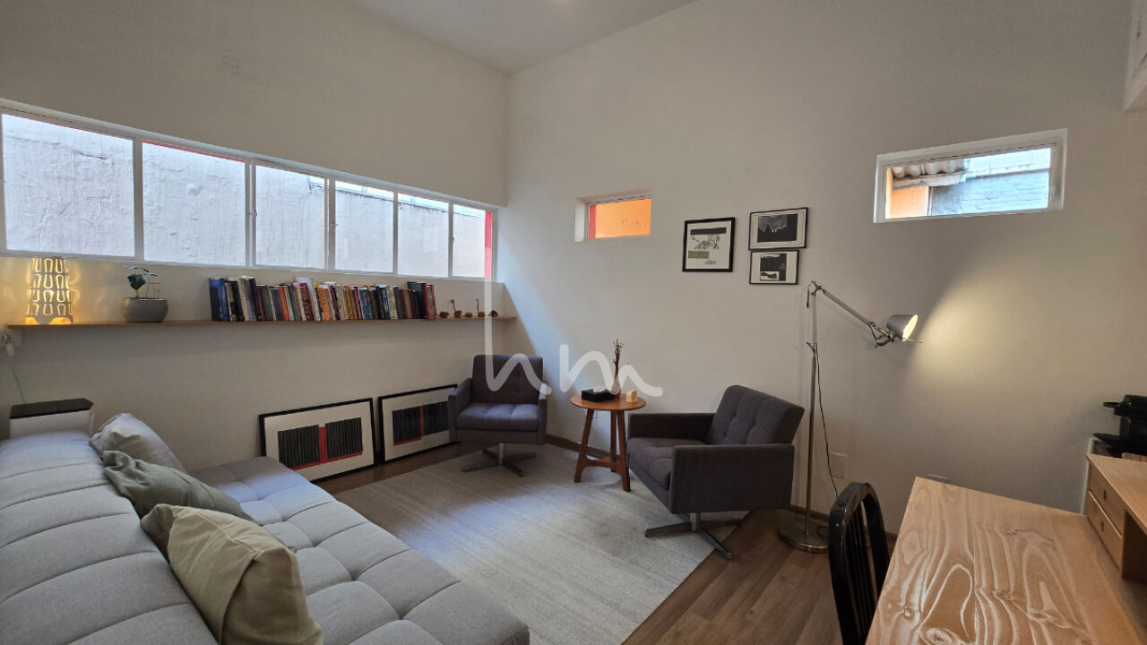 O living original é generoso e iluminado, emoldurado pelos icônicos janelões de ferro que remetem à arquitetura de época. Ao fundo, sala de jantar espaçosa, lavabo social e uma cozinha com planta excelente pronta para ser integrada e modernizada com liberdade total de projeto.