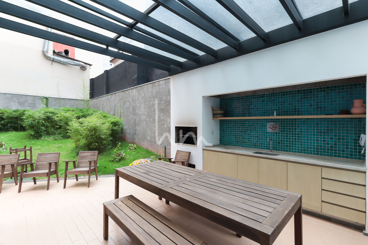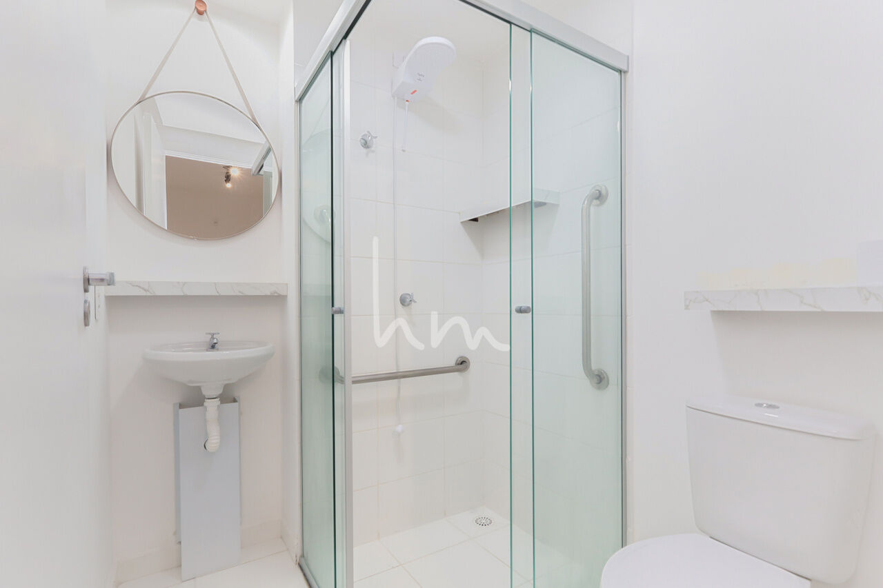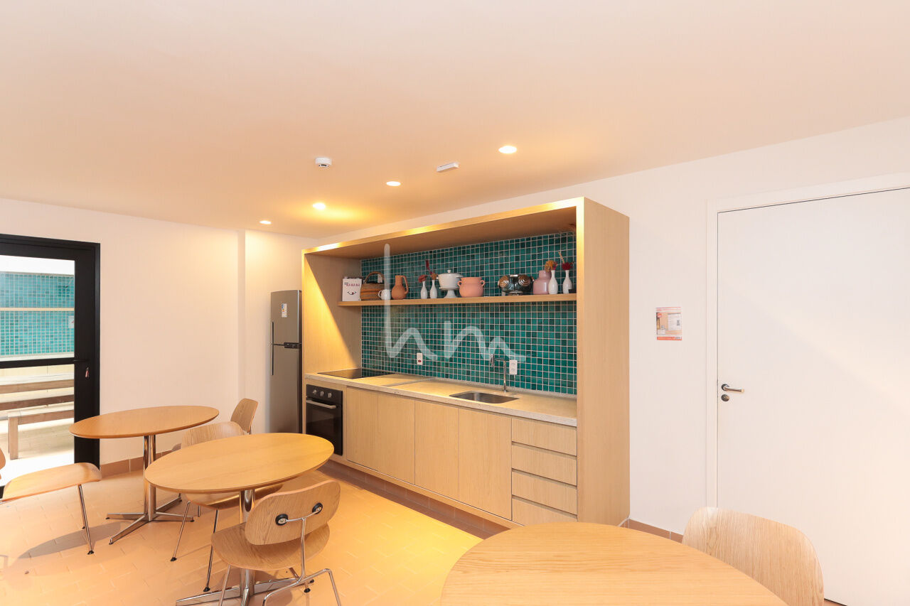A cozinha conta com armários planejados, bancada funcional e eletrodomésticos instalados, pronta para uso imediato. O banheiro possui acabamento moderno e ótimo estado geral. É uma unidade ideal para quem deseja entrar apenas com a mala, sem necessidade de reforma ou investimento adicional.